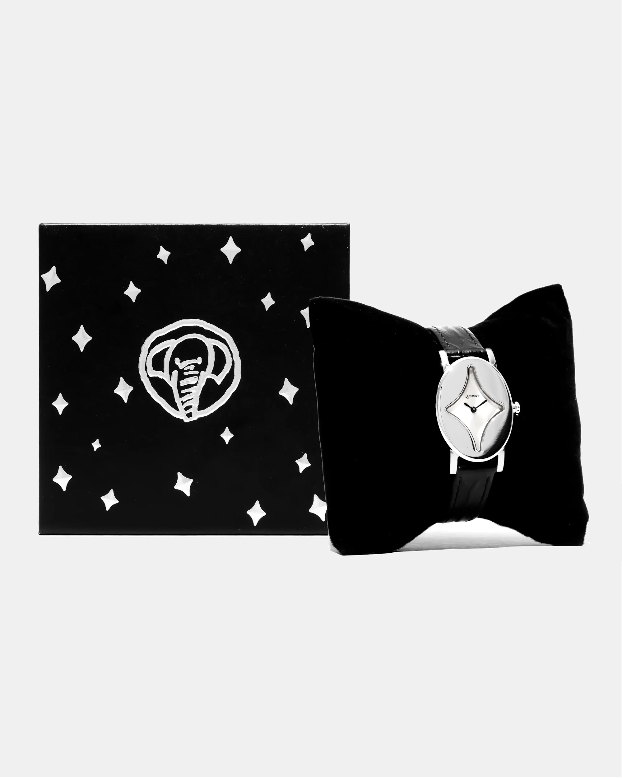 - Symmetric polished stainless steel case with custom shaped fitted glass